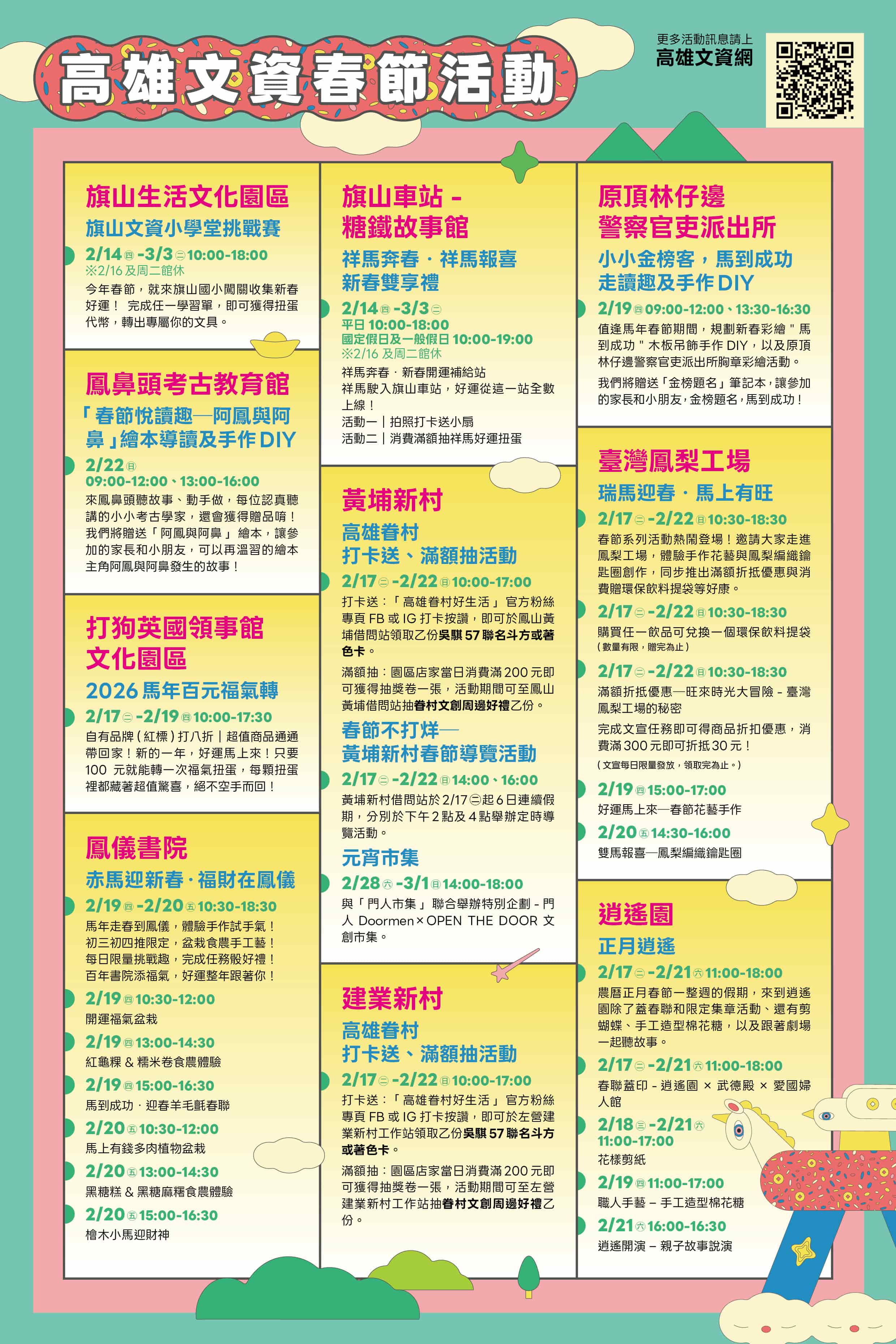除黃埔新村外,高雄多處文化資產場館也推出各具特色的春節活動,讓民眾可以依興趣規劃不同走春路線,感受文化場域的多樣風景;旗山生活文化園區舉辦「新春小學堂挑戰賽」,完成學習活動即可獲得扭蛋代幣;旗山車站-糖鐵故事館則推出拍照送小扇、消費滿額抽祥馬好運扭蛋及春節限定商品。打狗英國領事館文化園區推出「百元福氣轉」活動,百元就能轉出超值福氣扭蛋。