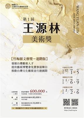 第1屆王源林美術獎得獎作品,謹訂於2026年3月6日至3月17日,在高雄市文化中心至真二館展出。2026年3月7日星期六下午3點30分舉行頒獎典禮。歡迎蒞臨共襄盛舉。